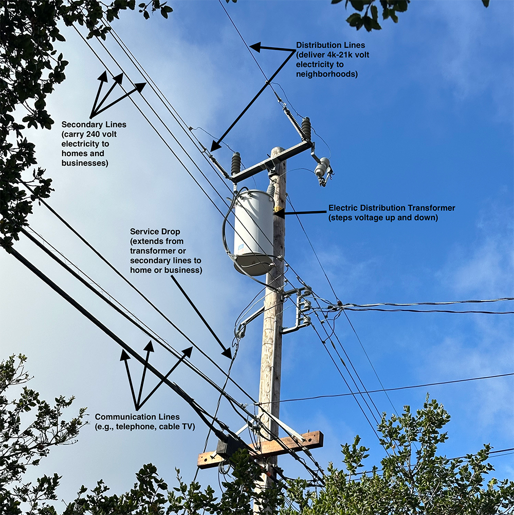 Neighborhood electricity distribution: If you’ve ever wondered what all the wires on your neighborhood power poles do, this picture may help!