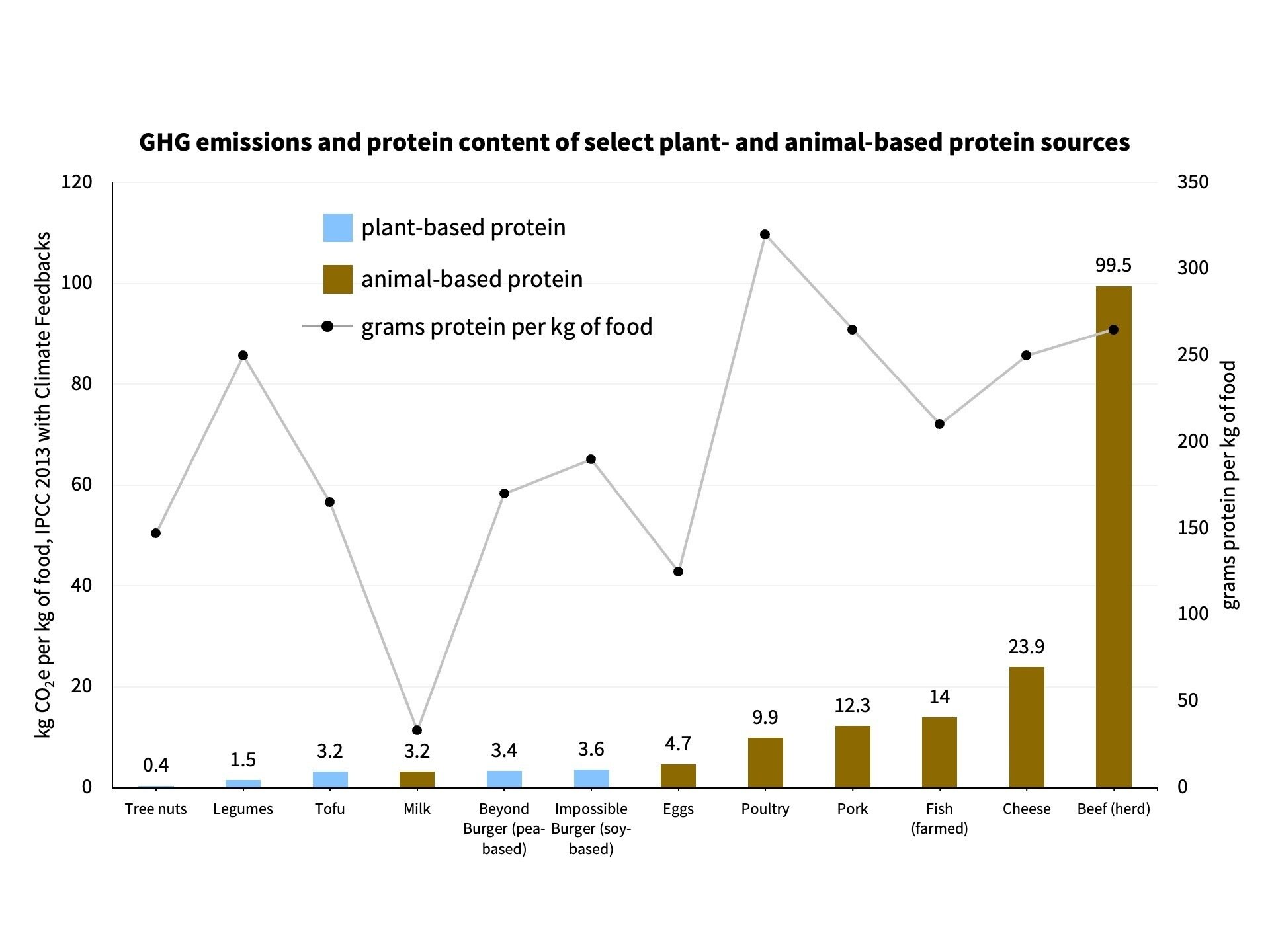 Different protein sources have different lifecycle GHGs and protein content. For example, plant-based “meats” (e.g., Impossible Burger, Beyond Burger) emit far fewer GHGs than animal meats because raising animals for food is extremely GHG-intensive.